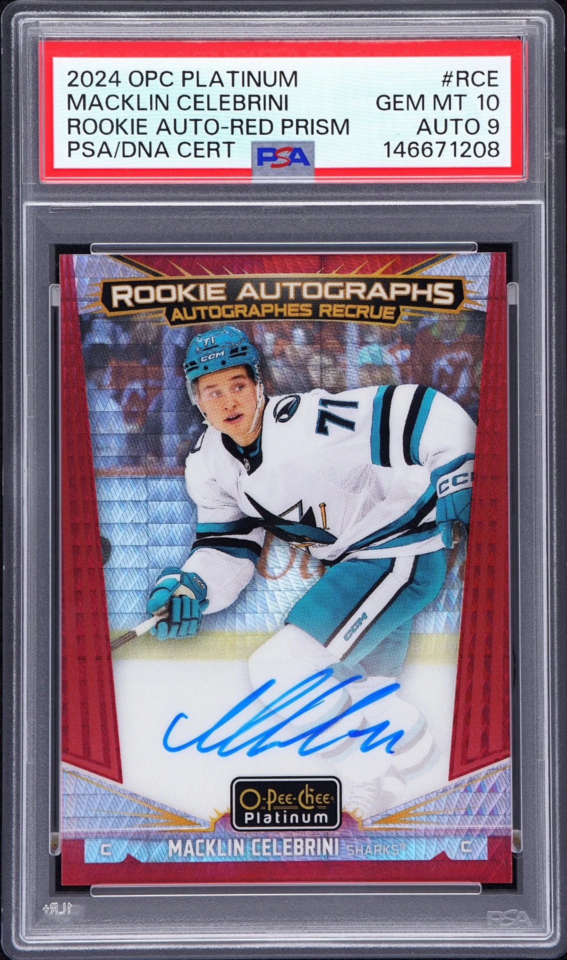 O-Pee-Chee Platinum Macklin Celebrini Red Prism Rookie Auto